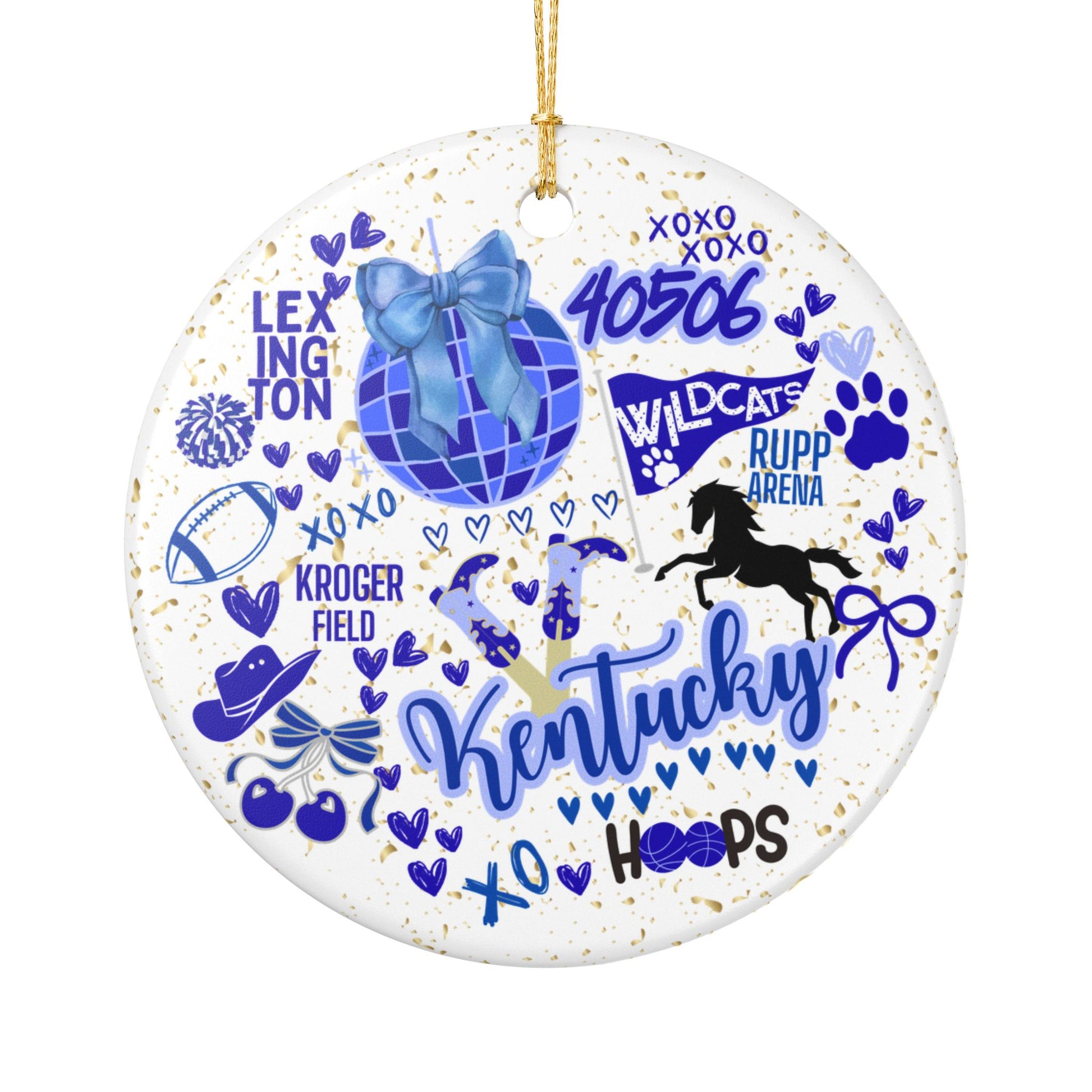 Spirit Kentucky fan Christmas ornament made of 100% ceramic material. Features a glossy finish with a matte print and comes with a gold string for hanging. Perfect decoration for the holiday season for any devoted Kentucky fan.