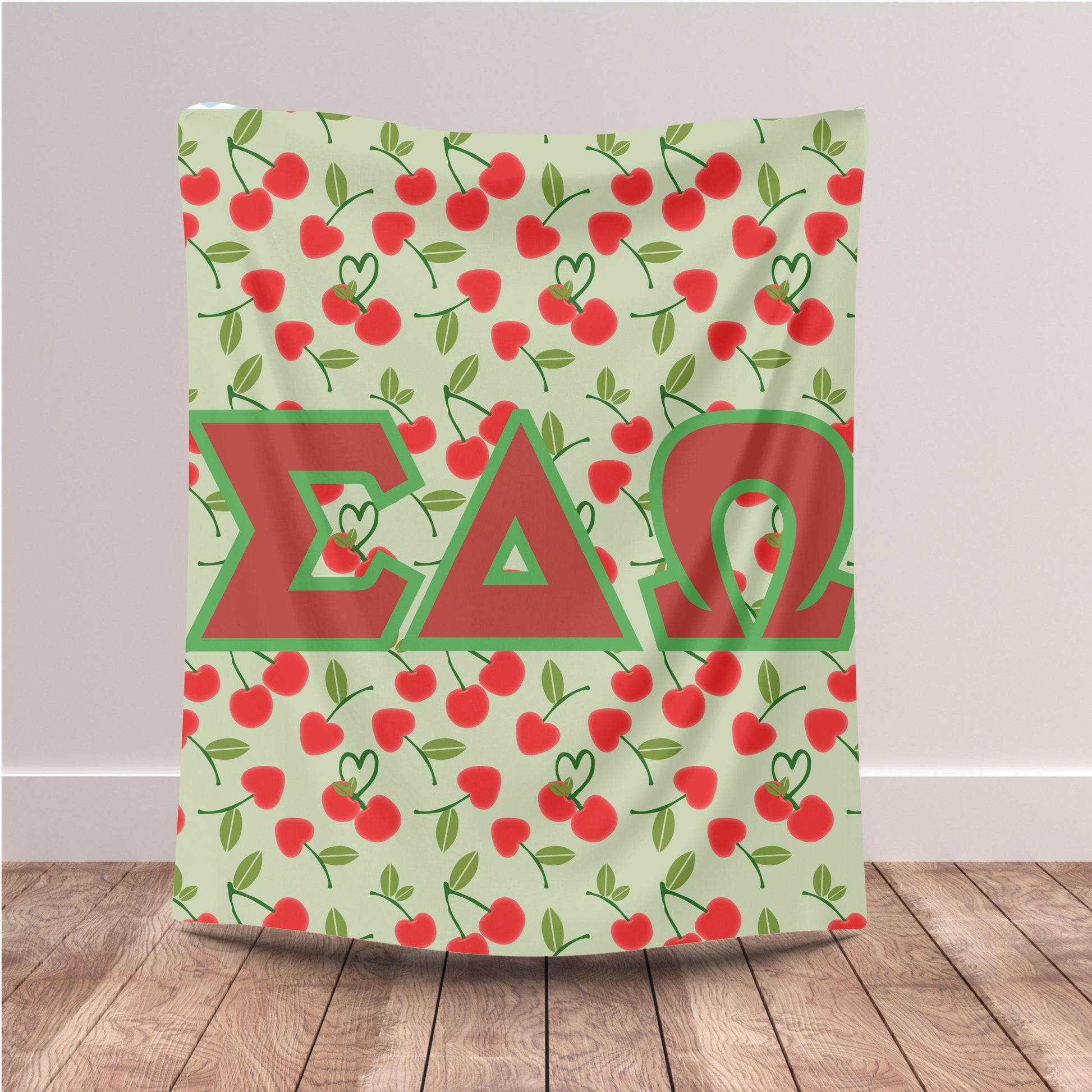 Stay warm and cozy with this personalized sorority blanket featuring a cherry background and your letters. Perfect for gifting to a sister or adding a touch of style to your space. Ideal for adults and suitable for various occasions like birthdays, holidays, and sorority events.