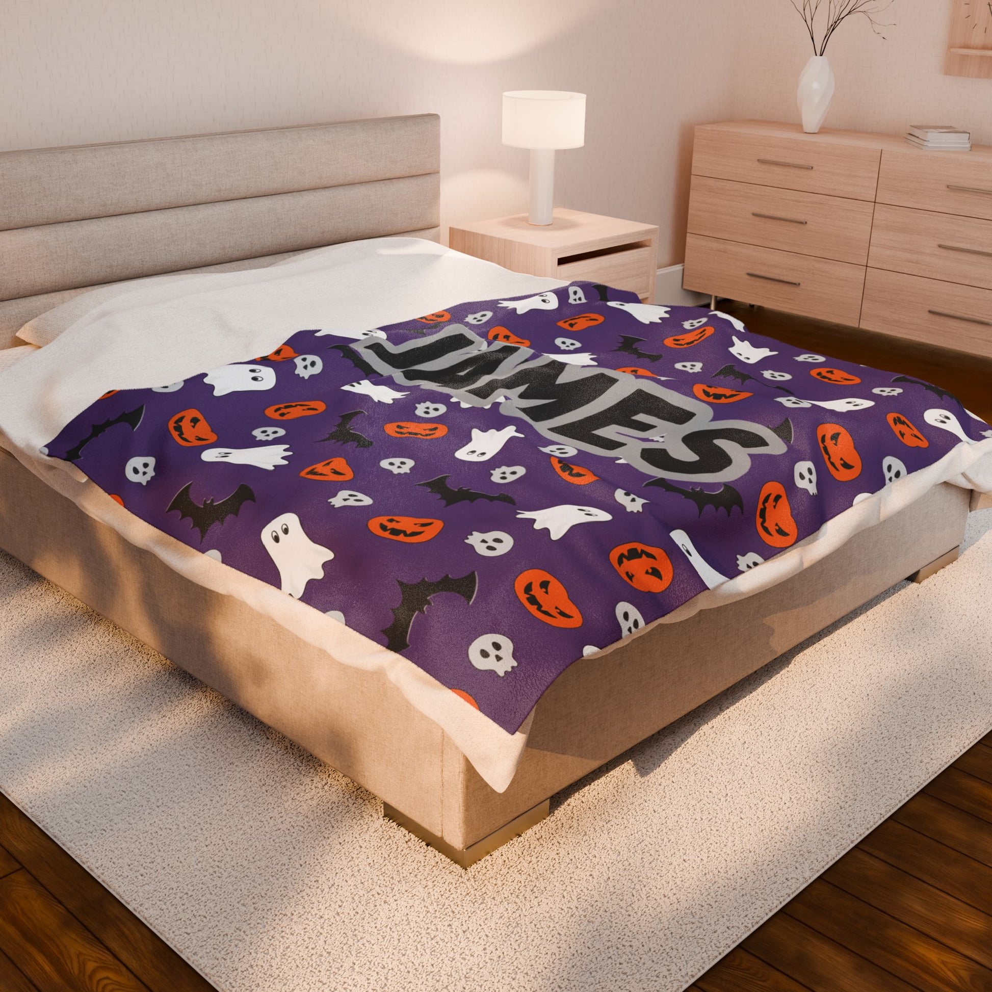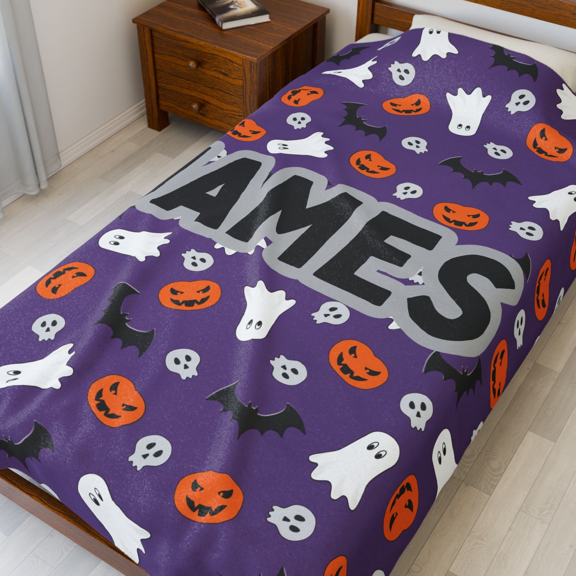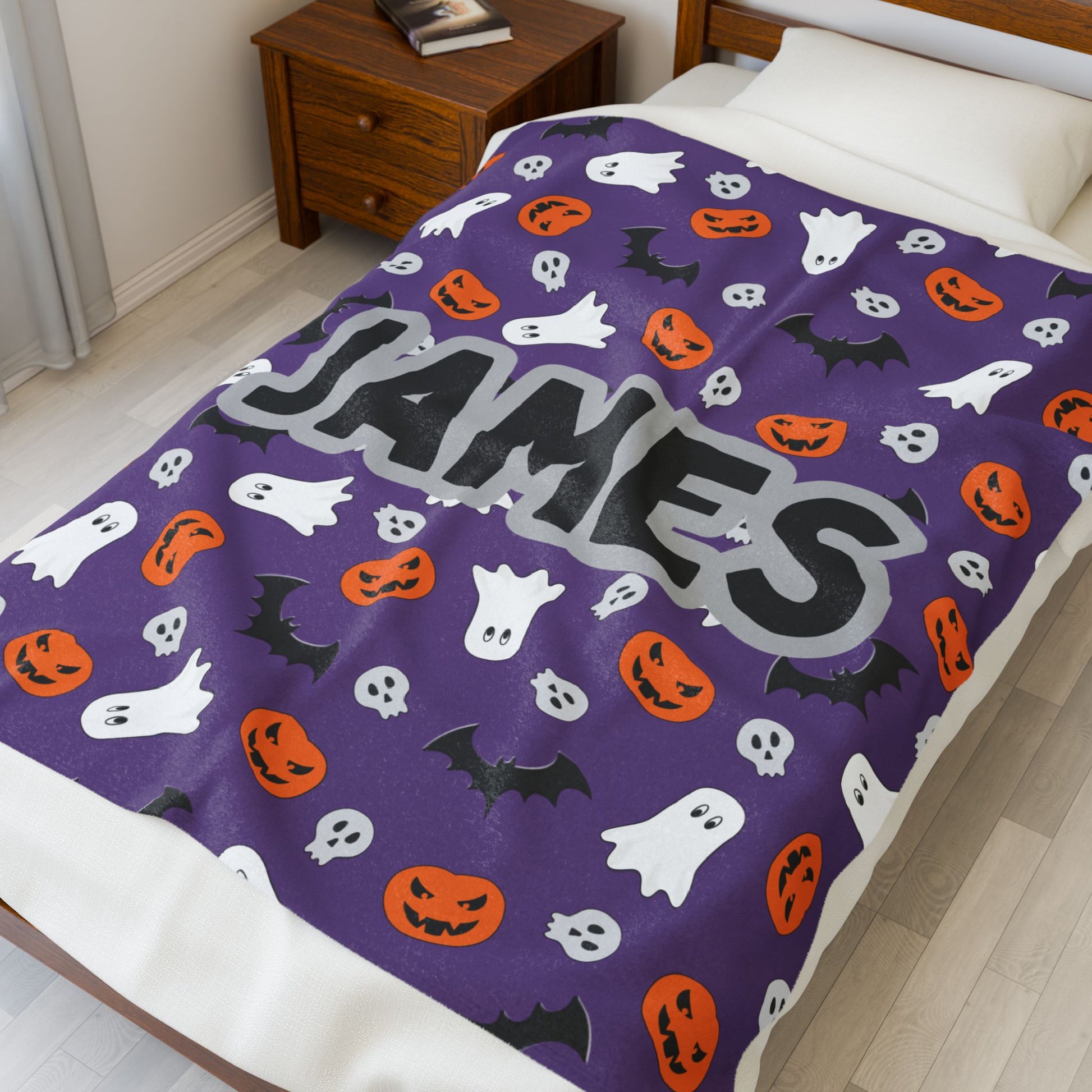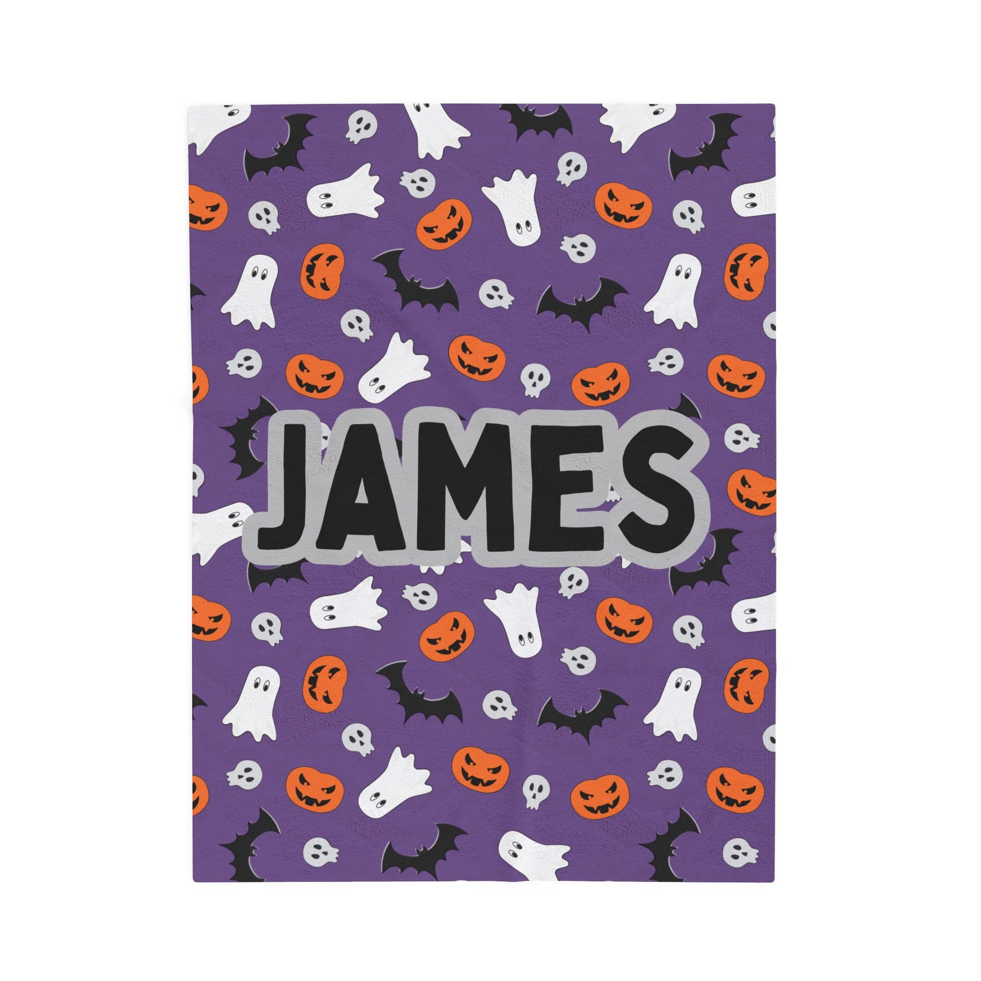 Plush Halloween Blanket, Personalized Name Ghosts and Pumpkins, Purple, Boy, Halloween Decor, Halloween Gift, Halloween Bedding, Halloween